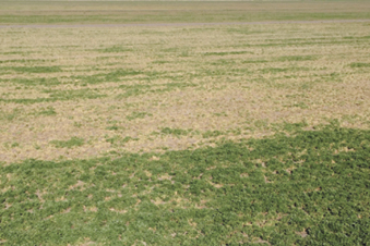 An alfalfa plant is shown infected with blue alfalfa aphids. In cooler regions, the pest often gets to the crop before beneficial predatory insects.
