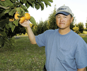 I just started picking persimmons. The yield looks a lot better than last year. The quality looks good. I was a little worried about the size, with the way the weather was ramping up and the amount of time they had in the growing season. But they sized up well. They’re finally starting to ripen up. They’re ripening a lot faster than normal, so I’m looking to have a speedier harvest to get them off the trees. The persimmons are marketed throughout the Bay Area under my brand Lum Family Farms. They’re going into the wholesale market.